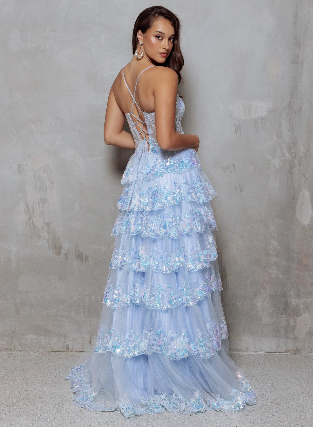 Filicite by Tania Olsen Designs is a stunning piece adorned with tiered ruffle tulle and lace details, evoking an exquisite princess-like feel. Perfect for any special occasion.