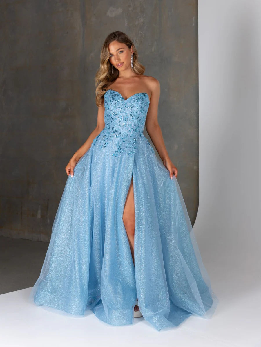 Introducing the Haisley dress from Tania Olsen Designs. This strapless a line dress is beautifully designed with a divine and gorgeous princess look. Shimmer with every step in its gorgeous striking glitter tulle. Perfect for any special occasion, its elegant silhouette will make you feel like royalty. Perfect for formals, galas, weddings, and formal evenings.