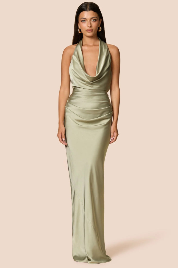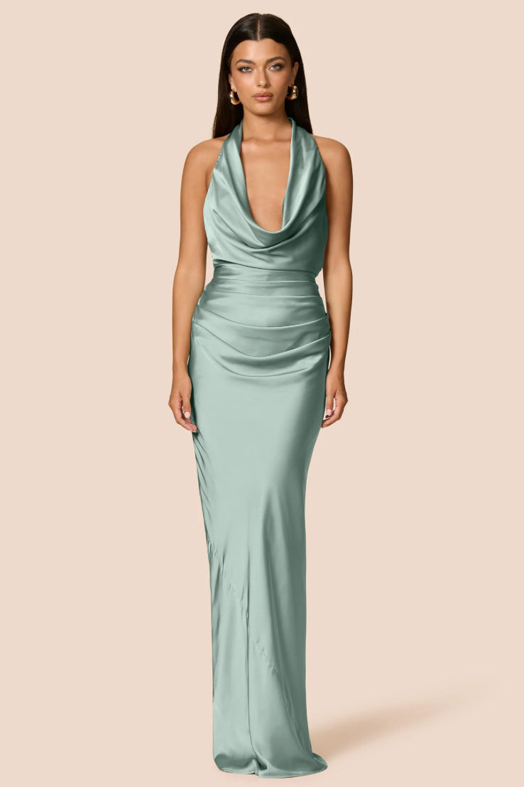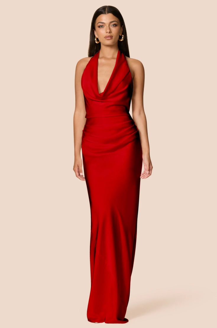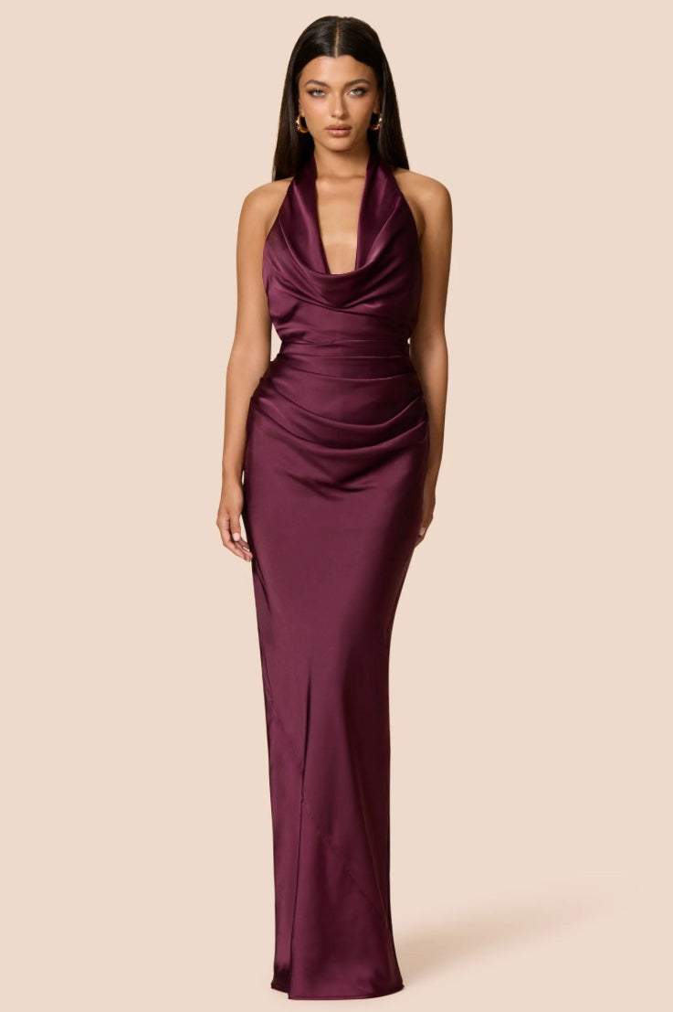 Elegant and flattering, the Penelope halter gown is designed with a draped neckline and deep tucks at the side waist for a sleek silhouette. The tie up at the back ensures a perfect fit. Made from light weight satin and is fully lined, it is comfortable and stylish for any occasion. Show up to your next event in the Penelope.