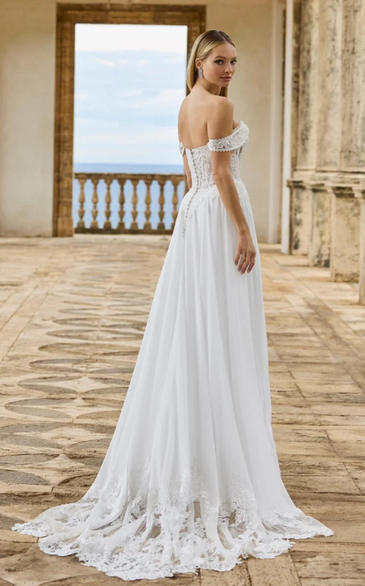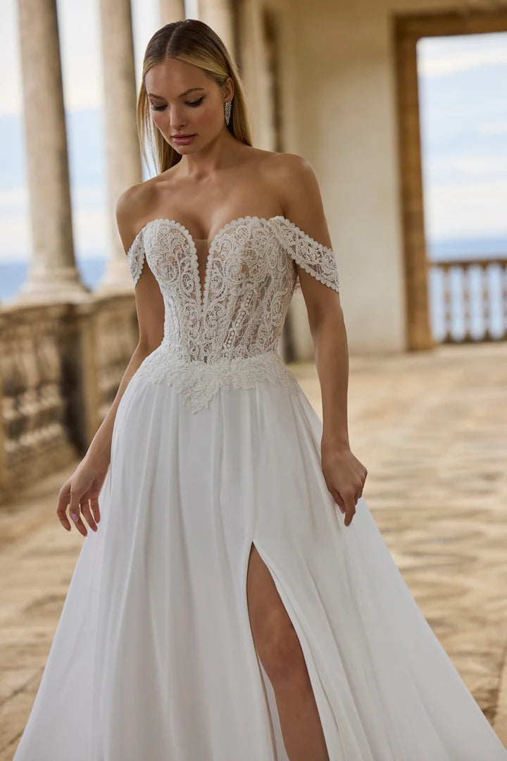 A stylish and contemporary off-the-shoulder relaxed A-line wedding dress, showcasing a high slit and a contrasting boho lace bodice that flows into a chiffon A-line skirt.
