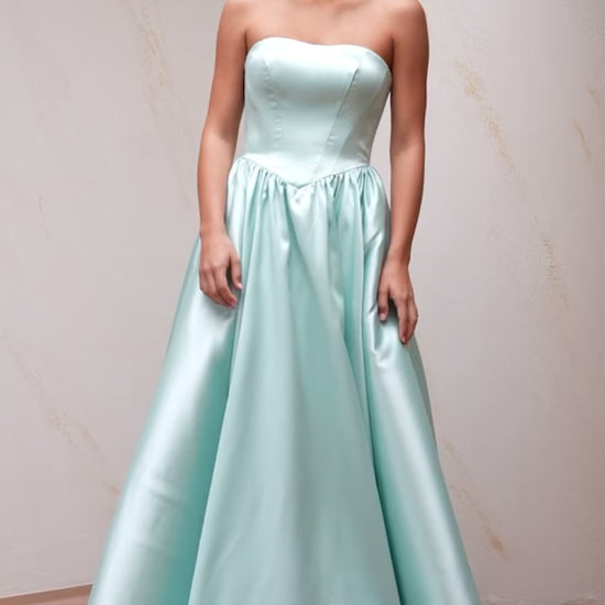 The Delaney Formal Dress is a floor-length A-line gown designed for timeless elegance and graceful movement. The skirt features gathering at the top for added volume and fullness, finished with a thick horsehair trim to enhance structure and flow. The bodice showcases a subtle sweetheart neckline with a basque dip at the natural waist, creating a flattering and refined silhouette.