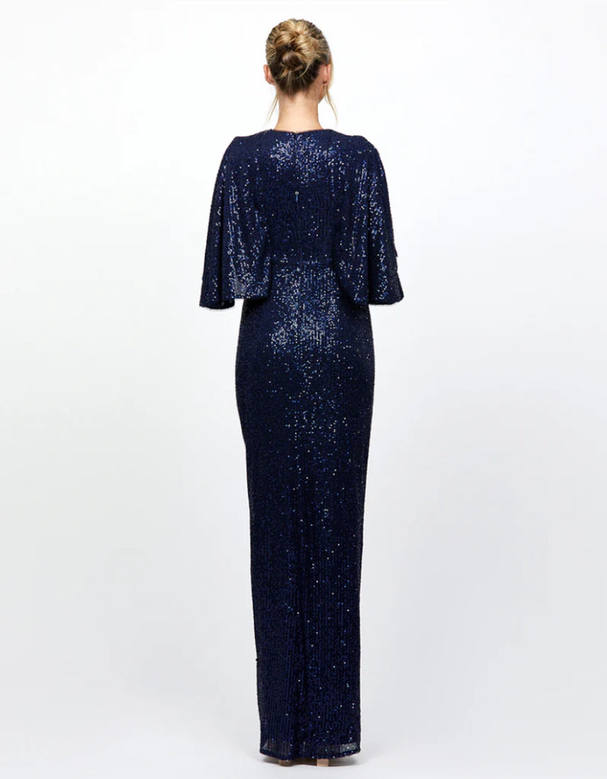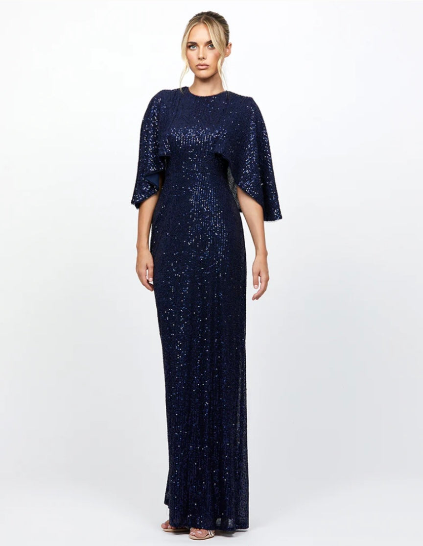 Elevate your evening look with this dazzling sequin gown, designed for timeless elegance and modern flair. Featuring a sophisticated high neckline and flowing mesh-lined cape sleeves, this dress makes a graceful statement. The structured bodice includes built-in bust cups for support and a keyhole back slit for a touch of allure. A full-length draped A-line skirt flows beautifully with every step, adding movement and glamour. Fully lined and finished with an invisible back zip closure, this gown is the perfect choice for black-tie events, galas, or any occasion where you want to shine.