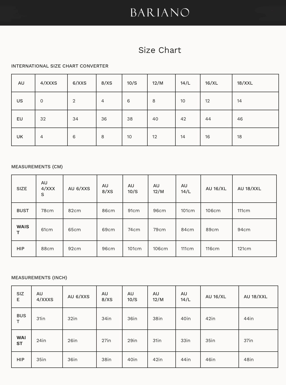 Sizes for BARIANO gowns range from AU 4-24