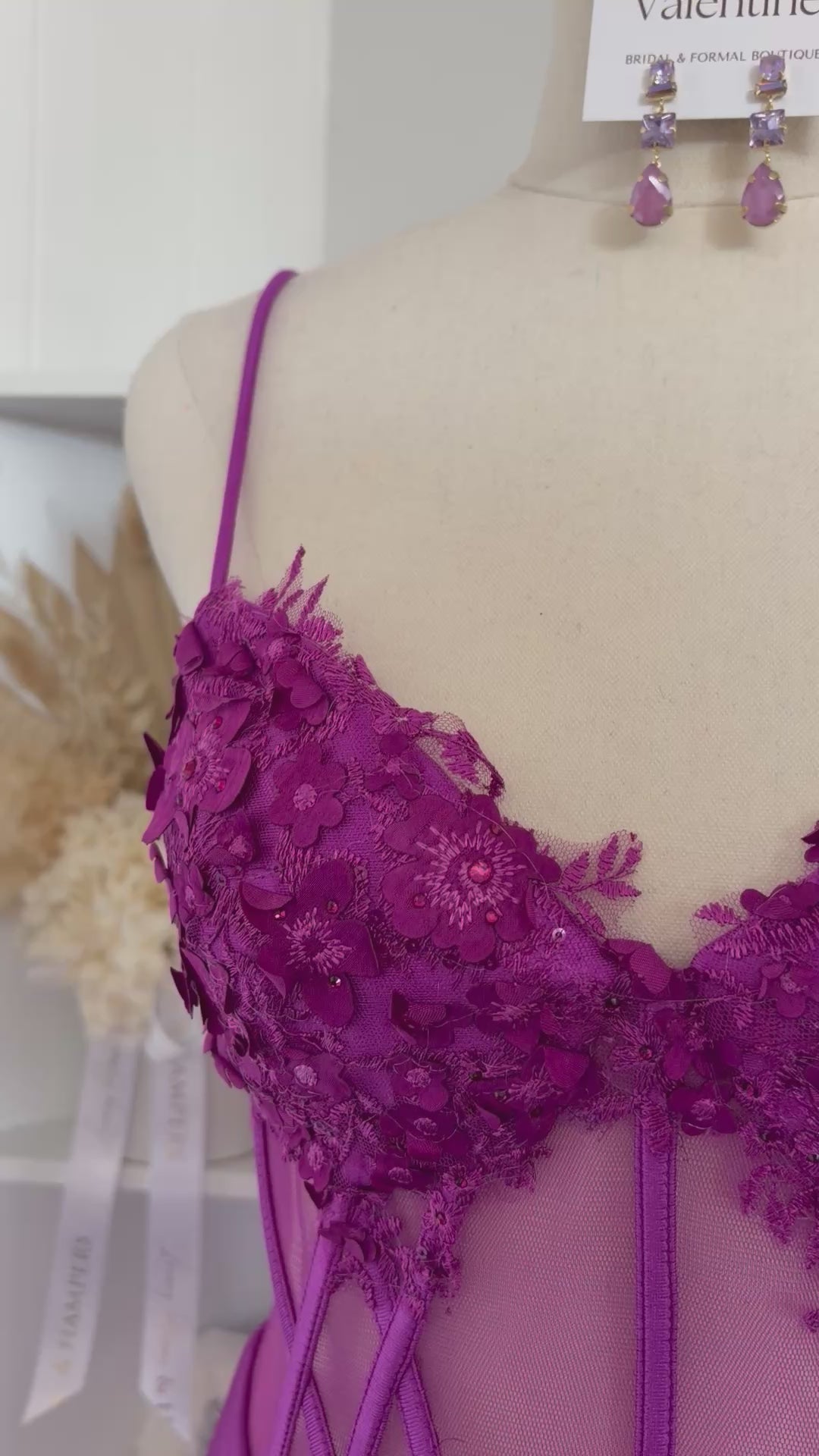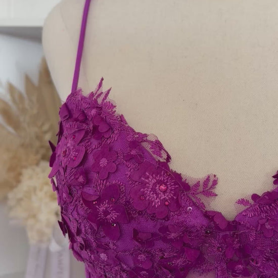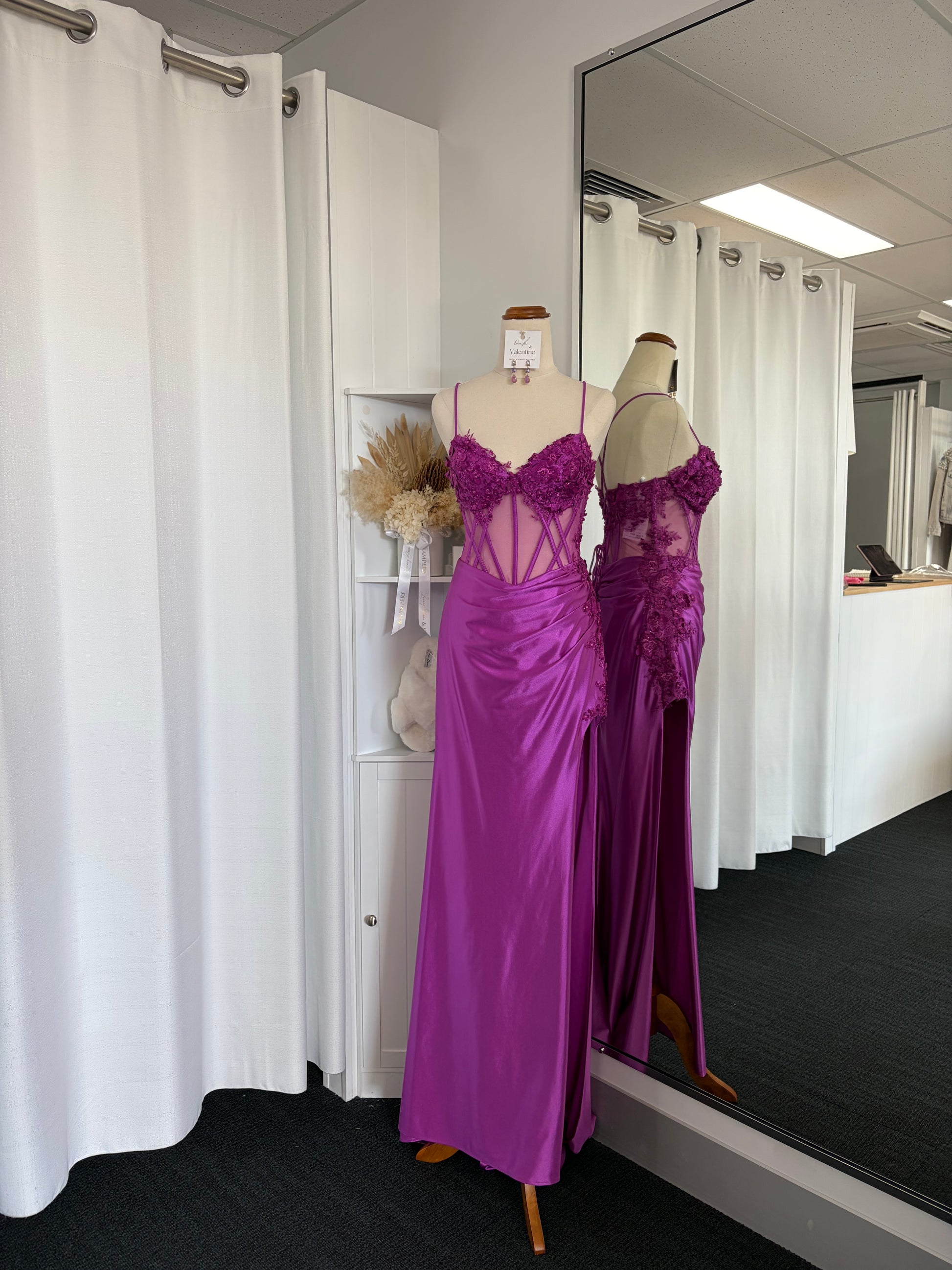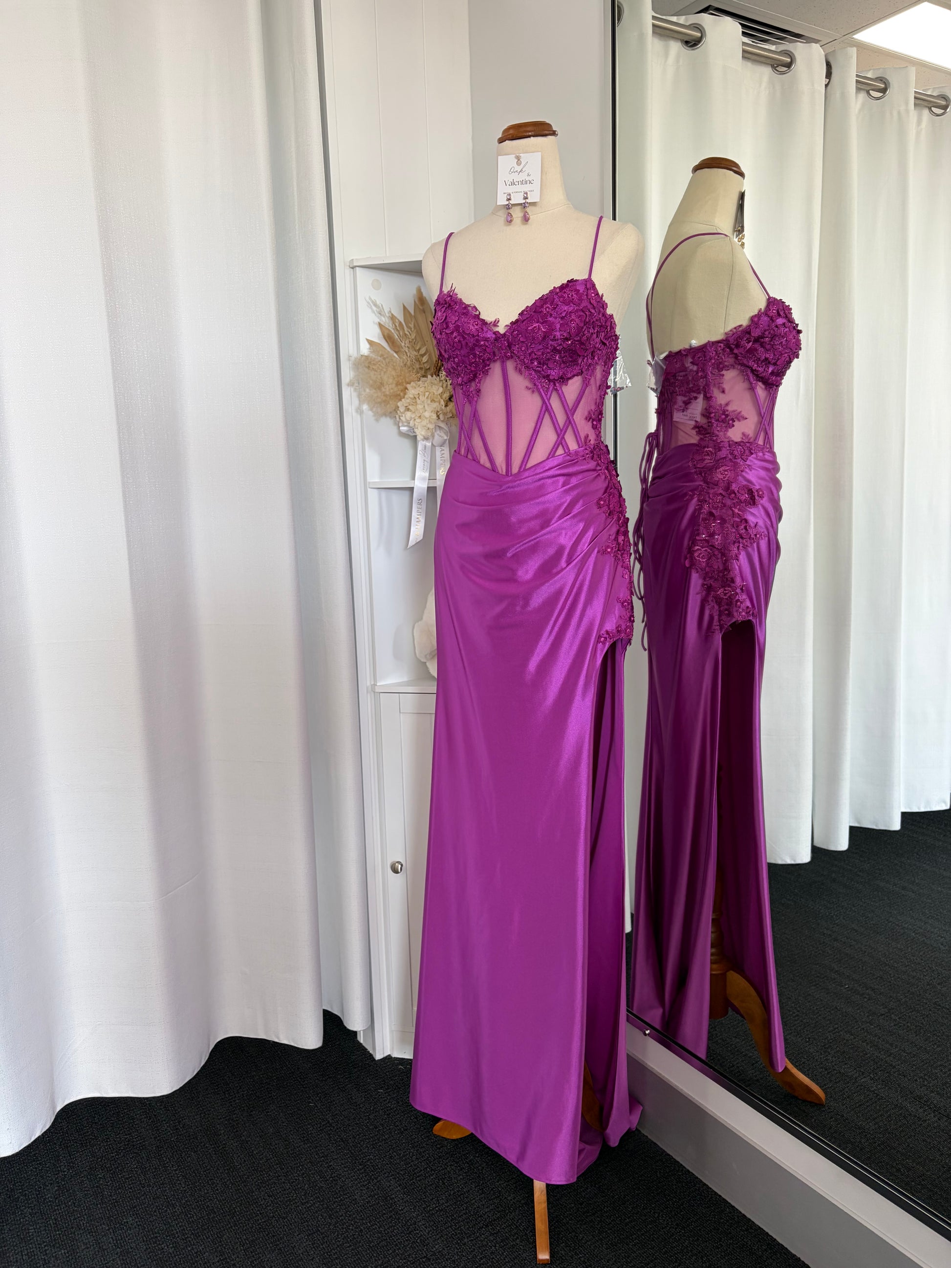 This exquisite gown features spaghetti straps and a fitted silhouette that beautifully hugs your figure. A daring thigh-high split adds allure, while the intricate lace back and boned illusion bodice provide support and sophistication. The 3D floral lace detailing on the bust cups and along the split brings a romantic touch, all crafted from luxurious stretch satin for ultimate comfort. Perfect for a night to remember!