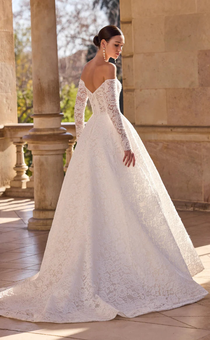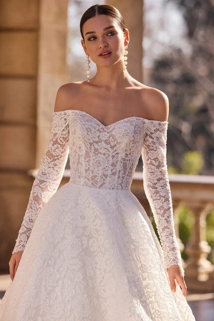 With its classic floral lace design and off the shoulder sweetheart neckline, Helisse by Veni Infantino is the epitome of modern elegance for today's bride. This ballgown wedding dress exudes sophistication and beauty, perfect for any bride looking for a timeless and romantic look on her special day.