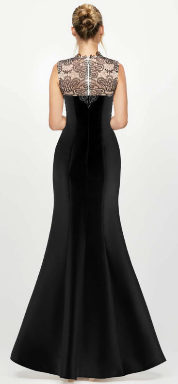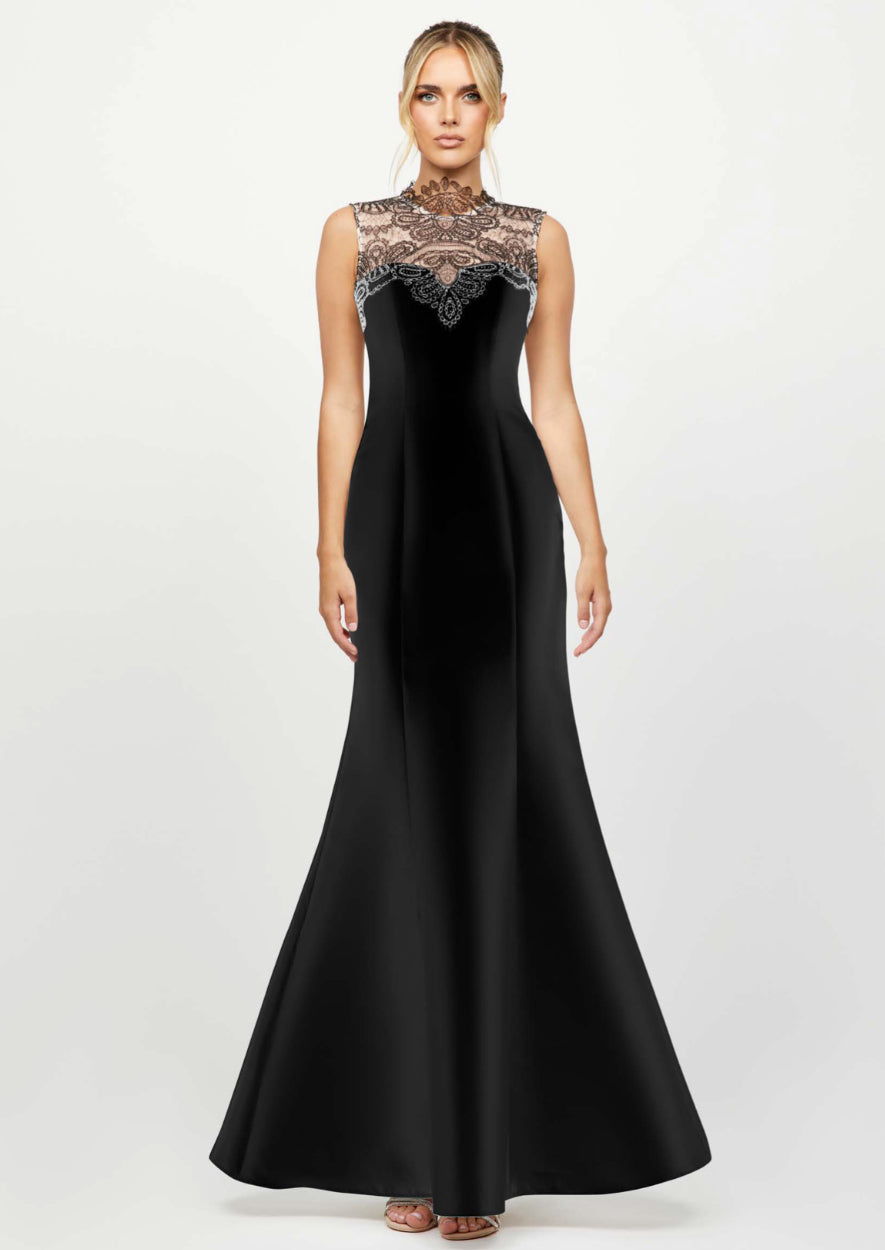 Introducing the “Jana” lace high neck gown. Made with luxurious duchess satin and delicate lace, this gown exudes elegance and sophistication. The high illusion neckline and structured bodice with boning provide a flattering fit, while the full length dramatic fishtail skirt adds a touch of drama. Perfect for any formal occasion.
