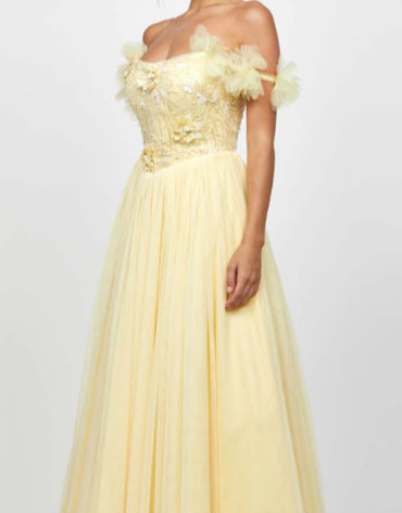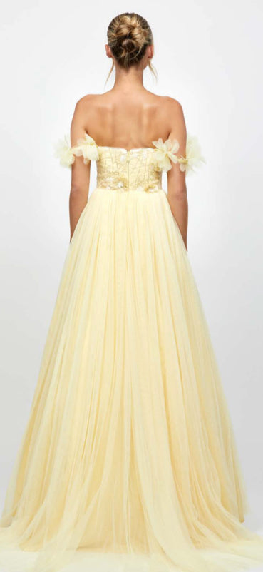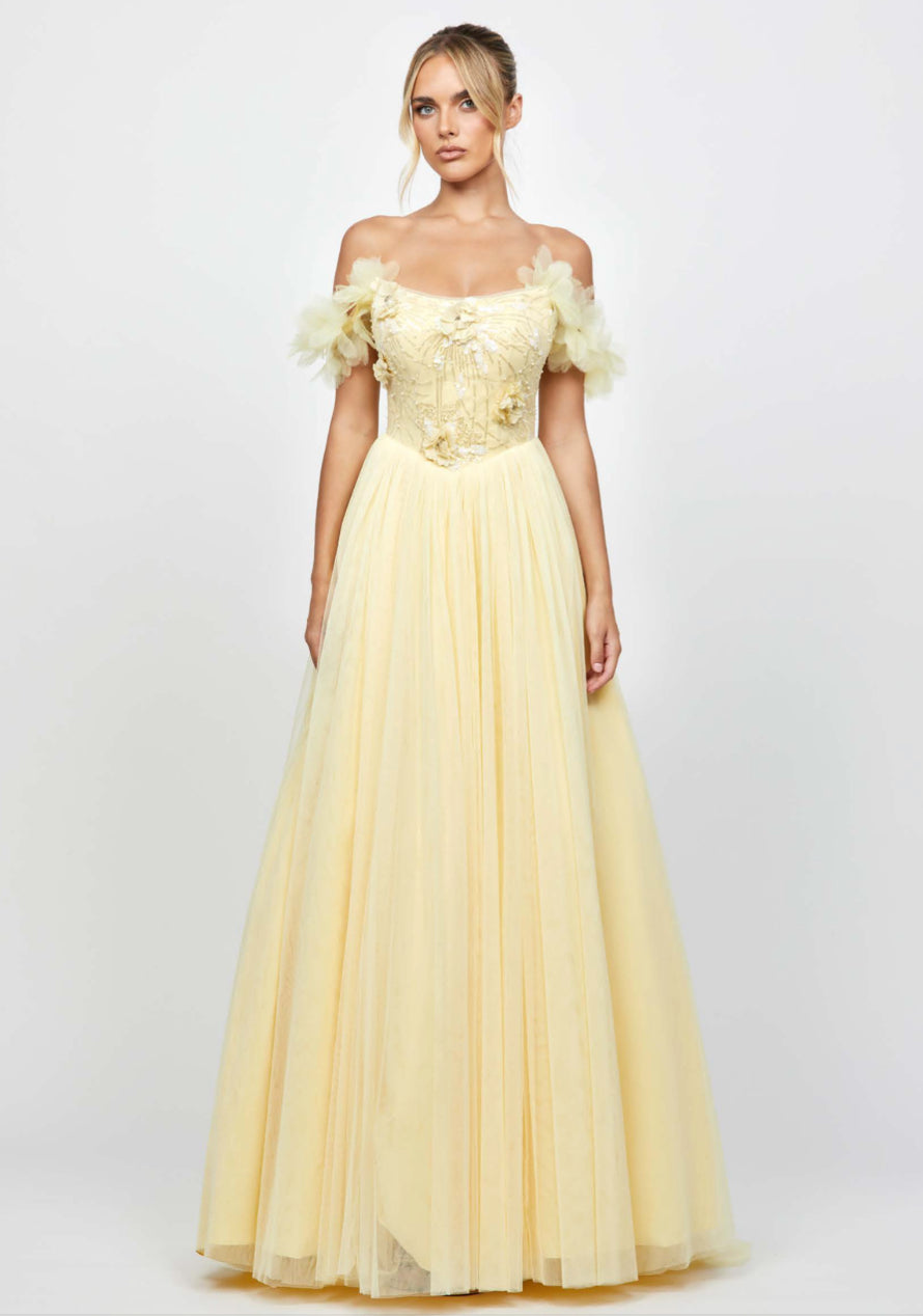 Keli by Bariano is a stunning off the shoulder ball gown featuring 3D floral lace and tulle. The strapless scoop neckline and detachable floral sleeves add a touch of elegance. The boned bodice and taping detail provide structure, while the dipped waistline highlights your figure. Perfect for any formal event.