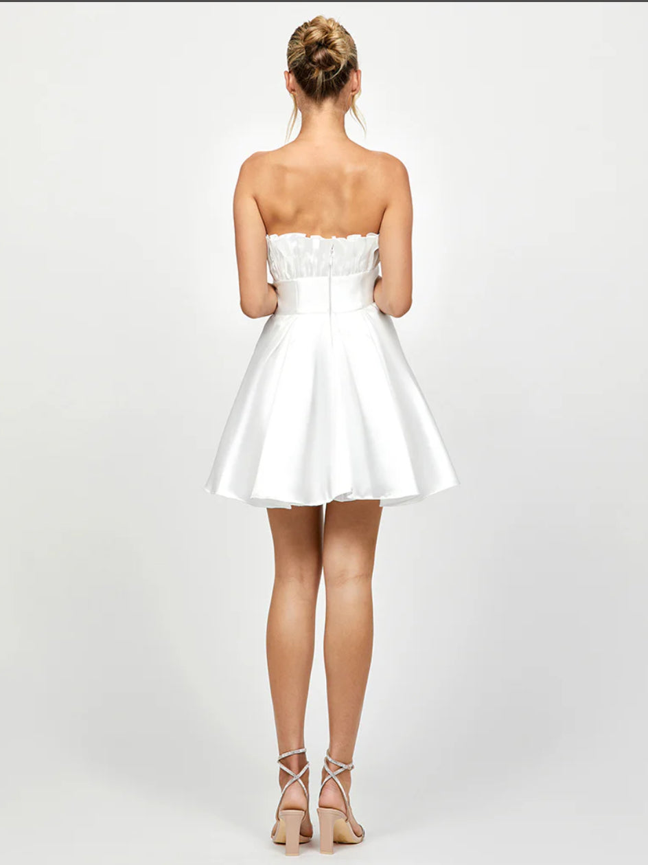 Step into effortless charm with this duchess satin mini dress, featuring a strapless straight-across neckline adorned with playful ruffled bust line detail. The structured bodice includes built-in bust cups and boning for a flawless fit, complemented by a wide waistband that accentuates your silhouette. The mini-length A-line skirt showcases elegant inverted tucks and convenient pockets, blending style and functionality. Fully lined with an invisible back zip closure, this dress is perfect for cocktail parties, special occasions, or any event where you want to make a chic statement.