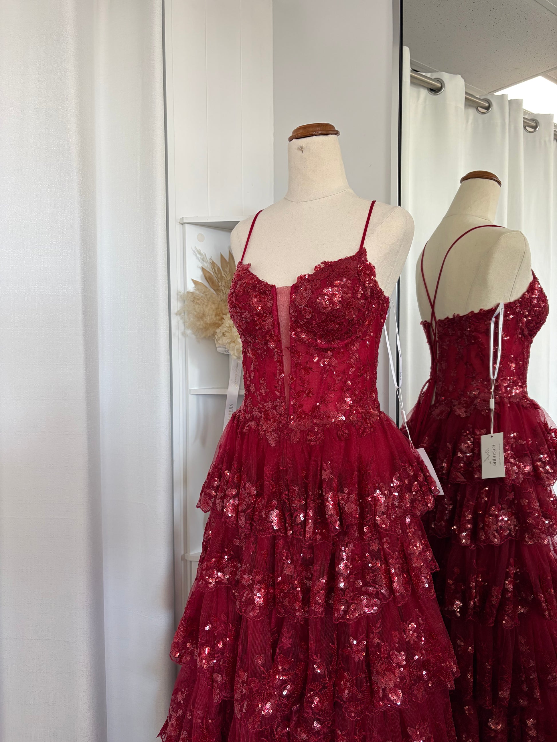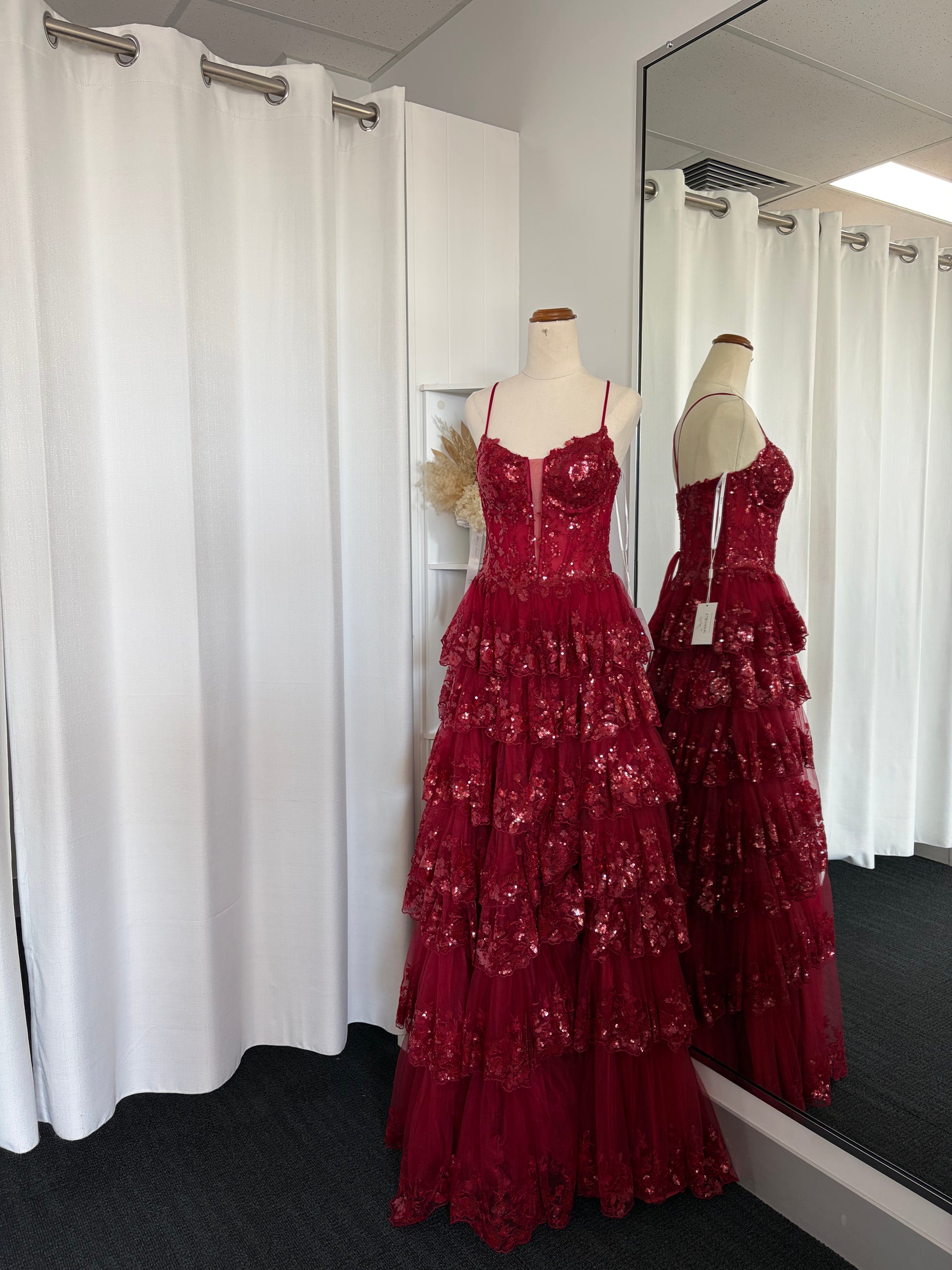 Our stunning Filicite Gown by Tania Olsen's Poseur collection features an elegant A-line silhouette that flatters a variety of body shapes. Its delicate spaghetti straps and structured boning provide both support and a refined fit. The sheer bodice is adorned with intricate sequin embellishments, adding a subtle shimmer that catches the light beautifully. A lace-up back allows for adjustable comfort and a personalized fit, while tiered layers create graceful movement and depth. Make your dreams come to reality with the Filicite.