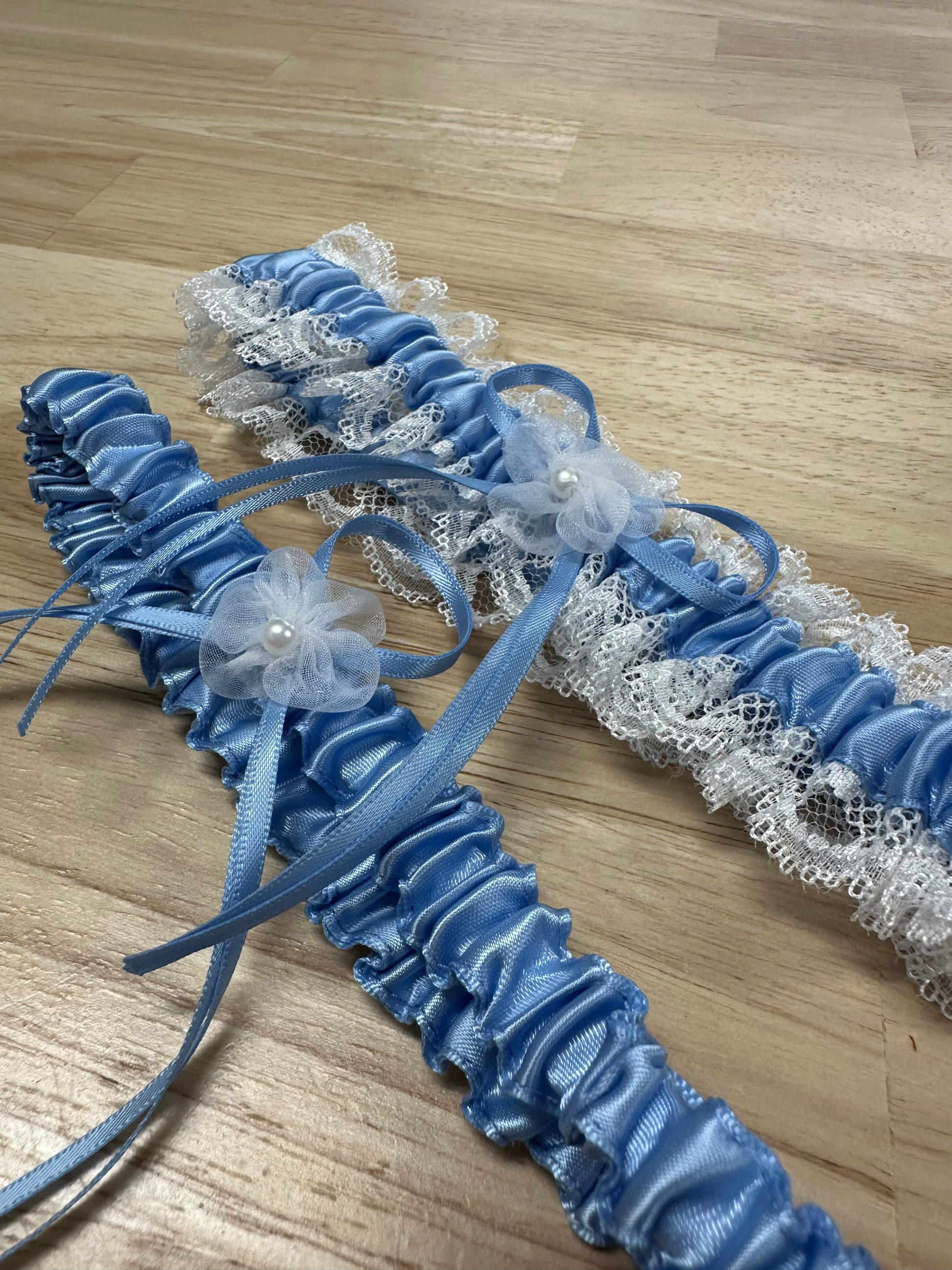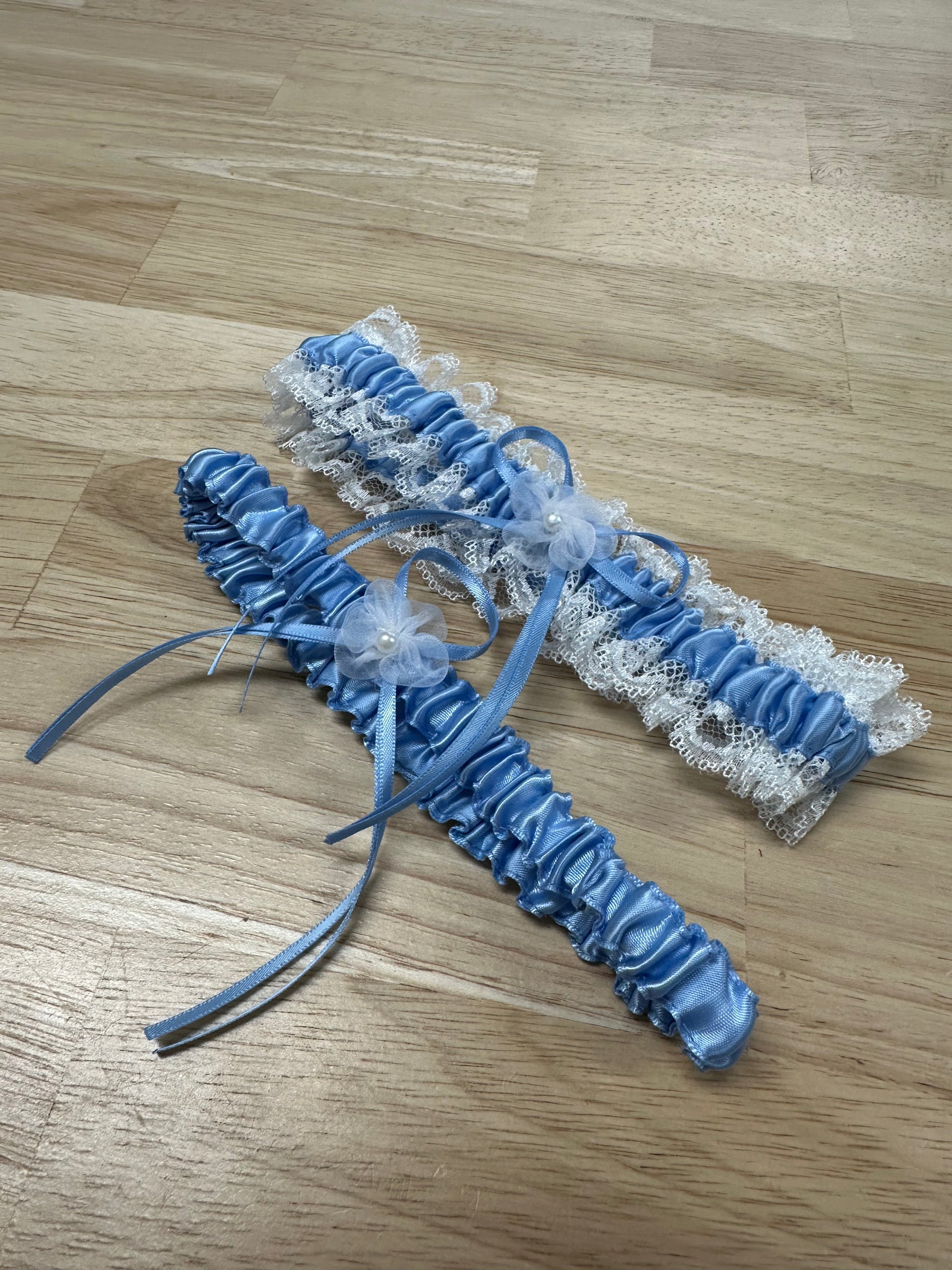 The Satin Lace Set offers a unique garter set with two striking designs to choose from. Featuring a satin and lace option with delicate flower and bow detail, as well as a simple sAton design adorned with a beautiful flower and ribbon detail.